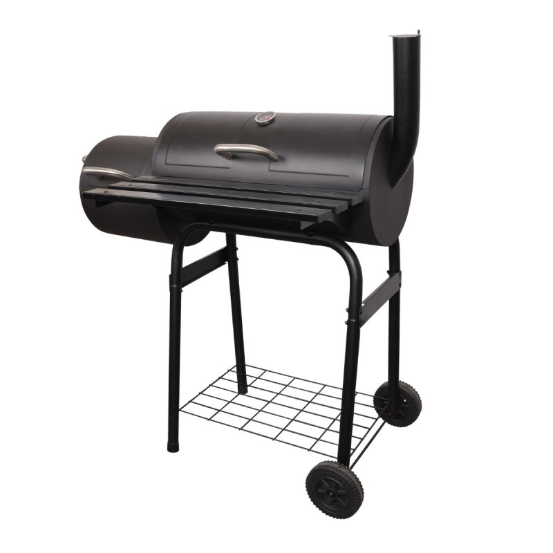 Grill dwukomorowy z funkcją wędzarni. Z regulowanym rusztem oraz wbudowanym termometrem. Wygodna półka z przodu na potrawy. Stabilna, dobrze wykonana konstrukcja.