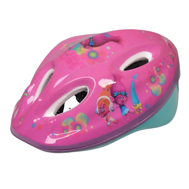 Kask rowerowy TROLLS w różowym kolorze, lekki i wytrzymały. Regulowany rozmiar M (52–56 cm), wykonany z PVC i EPS. Idealny dla dzieci, zapewnia bezpieczeństwo i bajkowy styl jazdy.