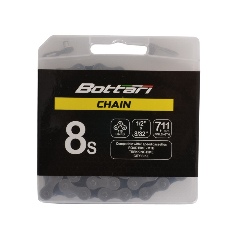 Łańcuch rowerowy Bottari 8s z 116 ogniwami i spinką. Do napędów 6/7/8 rzędowych. Idealny do rowerów miejskich, górskich, trekkingowych i szosowych. Trwałość i płynna praca napędu.