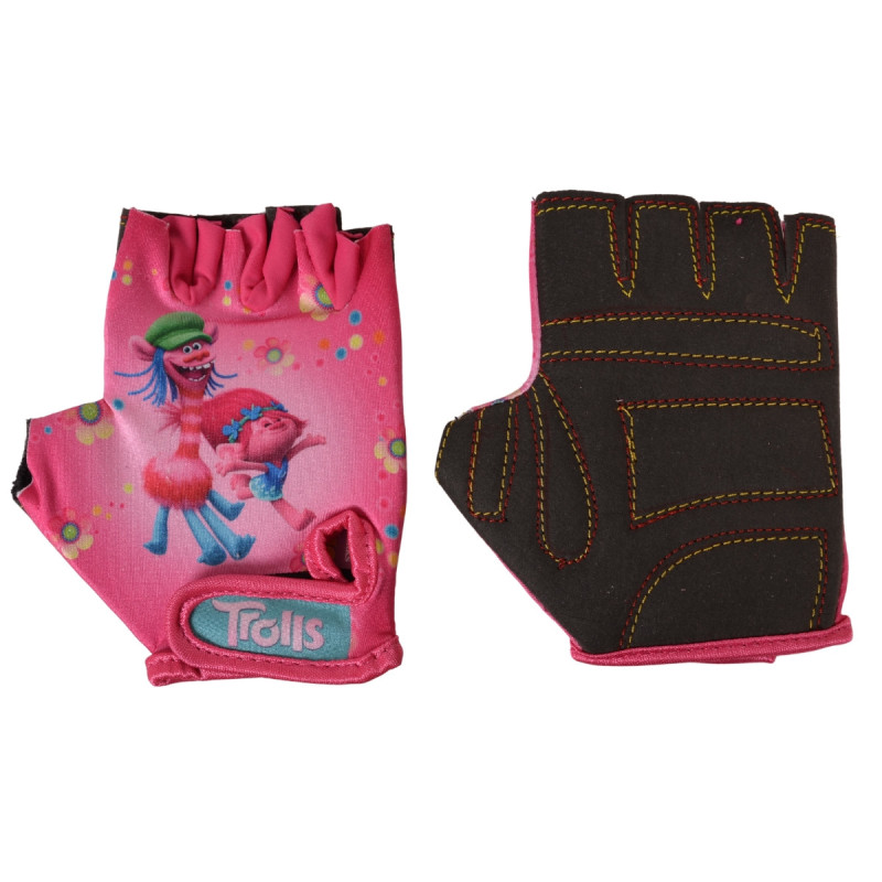 Rękawiczki rowerowe TROLLS w różowym kolorze, wykonane z poliestru i elastanu. Rozmiar 12 × 10 cm, zapinane na rzep. Zapewniają wygodę, pewny chwyt i ochronę dłoni podczas jazdy.